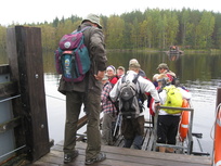 Repovedellä porukka jakautui kolmeen ryhmään, kovakuntoiset, veneellä matkaavat ja me, Seppo, Pirkko ja Seija. Me "puolikuntoiset" kiersimme Ketun lenkin, joka ei ollut kuin 5 km, mutta haasteita riitti. Mäkeä ylös ja alas, märkää juurakkoa ja kivikkoa ja entäs ne yli 200 rappusta näköalapaikalle. Vahinko , että veneellä menijät ehtivät ohi kun me vasta kapusimme rappusissa. Näköalapaikalta oli upeat näkymät järvelle, joten kannatti kiivetä. Sitten alkoikin helpompi osuus koskemattomassa metsässä ja alaspäin mennessä. Melkein rantakivillä kuljettiin hetken matkaa, kunnes tulimme käsivetoiselle lossille ja meidän lossimies kiskoi meidät yli lahden.