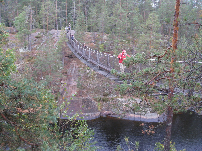 Patikoimme reippaasti edeten päiväretkeämme, kunnes yks'kaks havaitsin korkeanpaikan-kammoisena lieväksi kauhukseni: riippusilta, eikä mikään lyhyt. Päätin välittömästi, että heti yli, en yhtään jää ihmettelemään. Katse horisonttiin ja yli vaan. Näin toimien lievä vapina alkoi vasta ylityksen jälkeen katsellessa muiden hyvinkin rentoja ylityksiä. Ja matka jatkui yhtenäisellä porukalla.