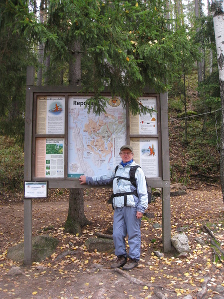 Repovedellä porukka jakautui kolmeen ryhmään, kovakuntoiset, veneellä matkaavat ja me, Seppo, Pirkko ja Seija. Me "puolikuntoiset" kiersimme Ketun lenkin, joka ei ollut kuin 5 km, mutta haasteita riitti. Mäkeä ylös ja alas, märkää juurakkoa ja kivikkoa ja entäs ne yli 200 rappusta näköalapaikalle. Vahinko , että veneellä menijät ehtivät ohi kun me vasta kapusimme rappusissa. Näköalapaikalta oli upeat näkymät järvelle, joten kannatti kiivetä. Sitten alkoikin helpompi osuus koskemattomassa metsässä ja alaspäin mennessä. Melkein rantakivillä kuljettiin hetken matkaa, kunnes tulimme käsivetoiselle lossille ja meidän lossimies kiskoi meidät yli lahden.